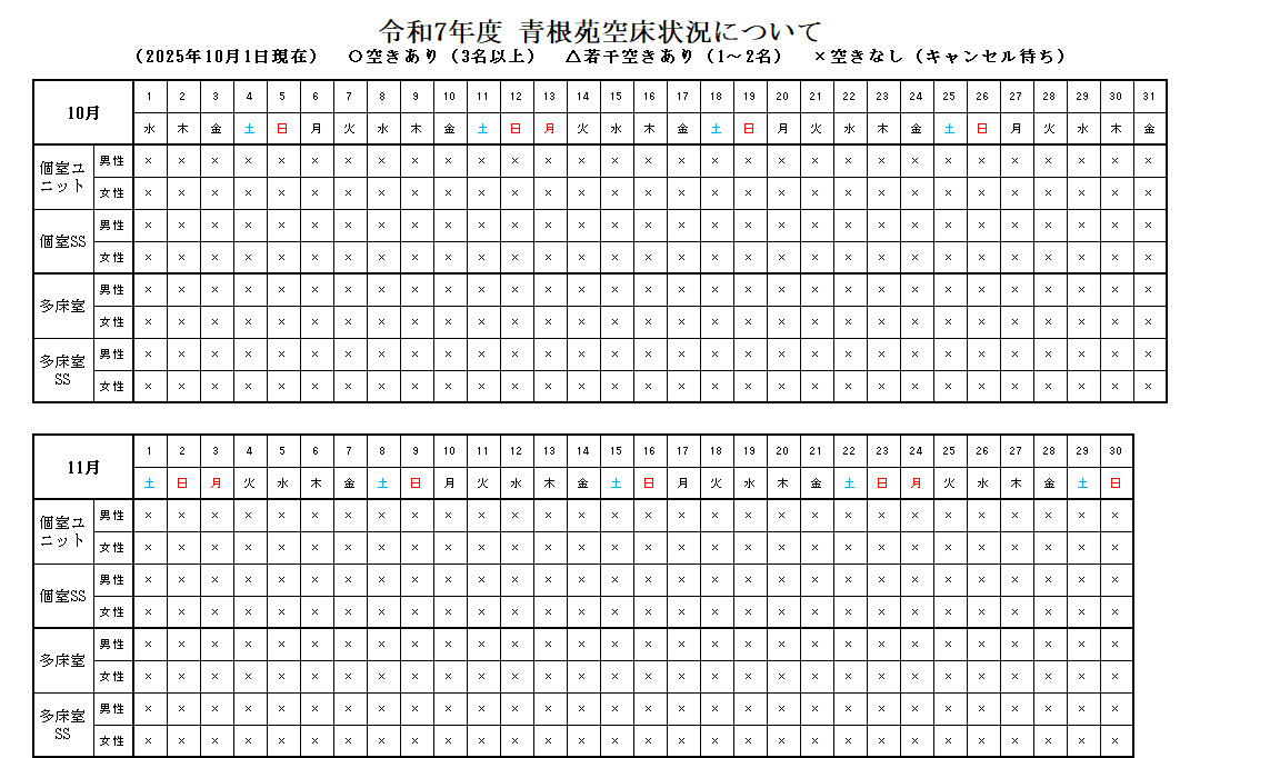また、ユニット型個室・多床室の入居については早めのご案内が可能な場合も御座いますので、ご希望の際は青根苑まで直接お問合せい