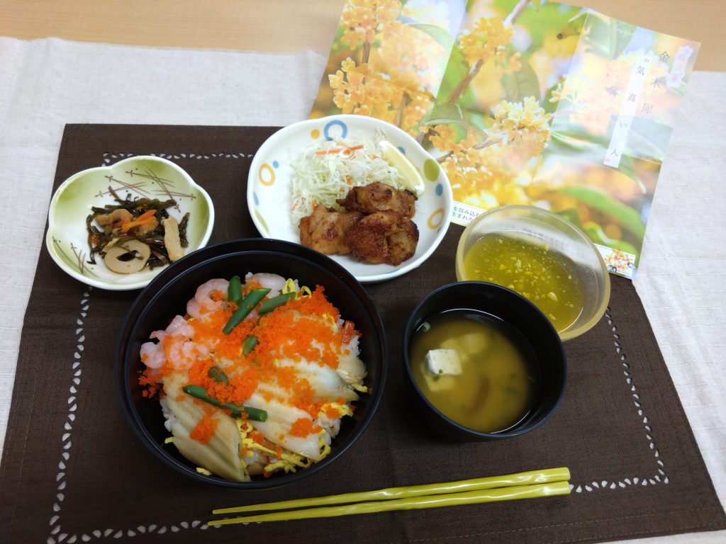 【メニュー】・鮭いくら丼 ・白菜とさつま揚げの煮物 ・金時煮豆 ・すまし汁