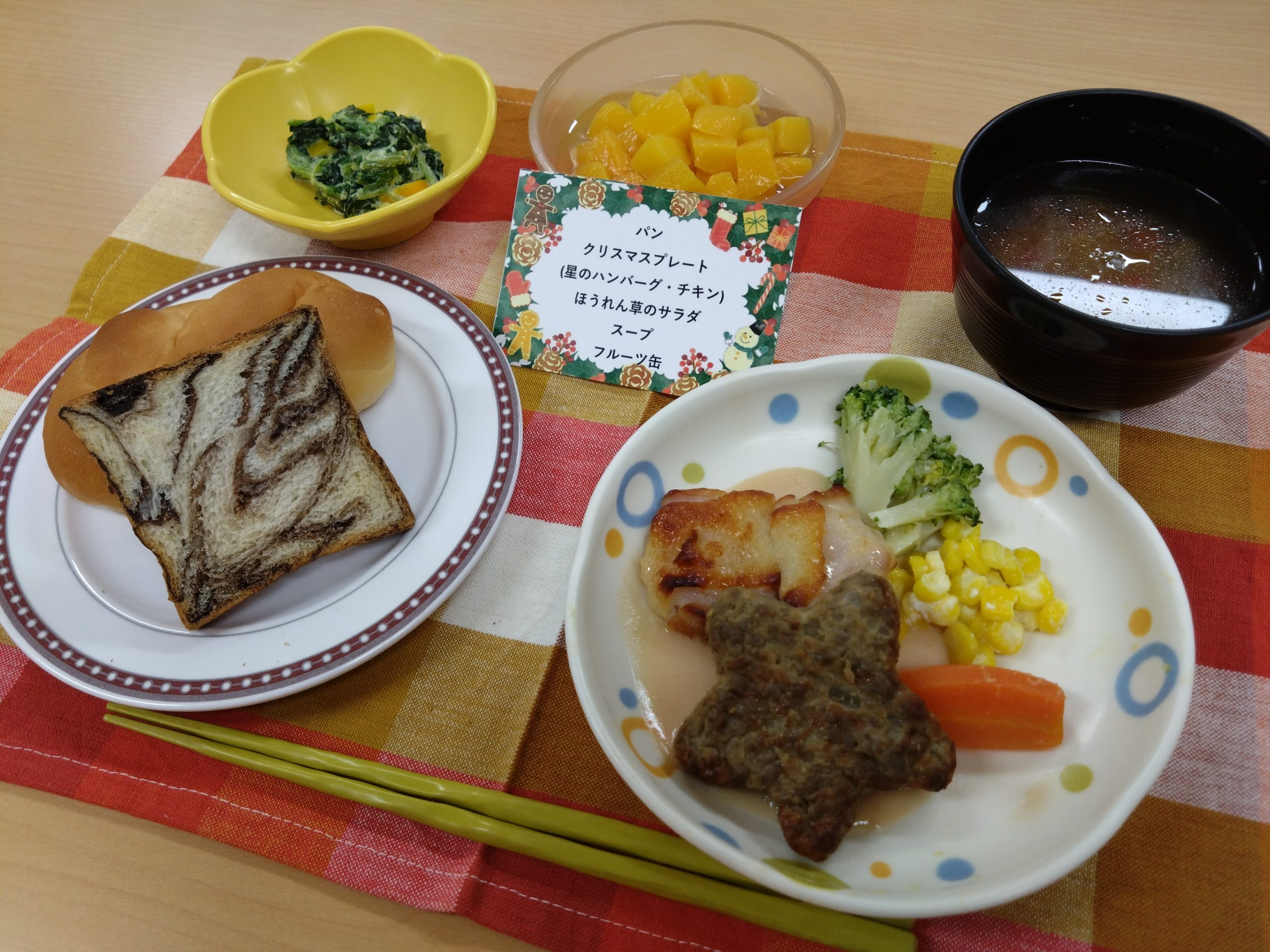 ・パン2種 ・クリスマスプレート(星のハンバーグ・チキンステーキ)