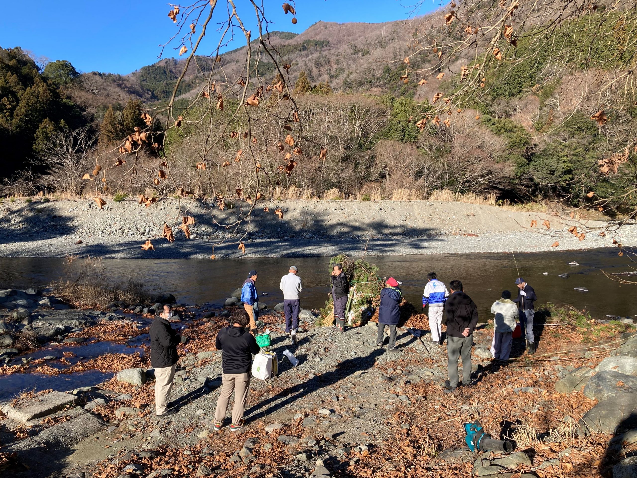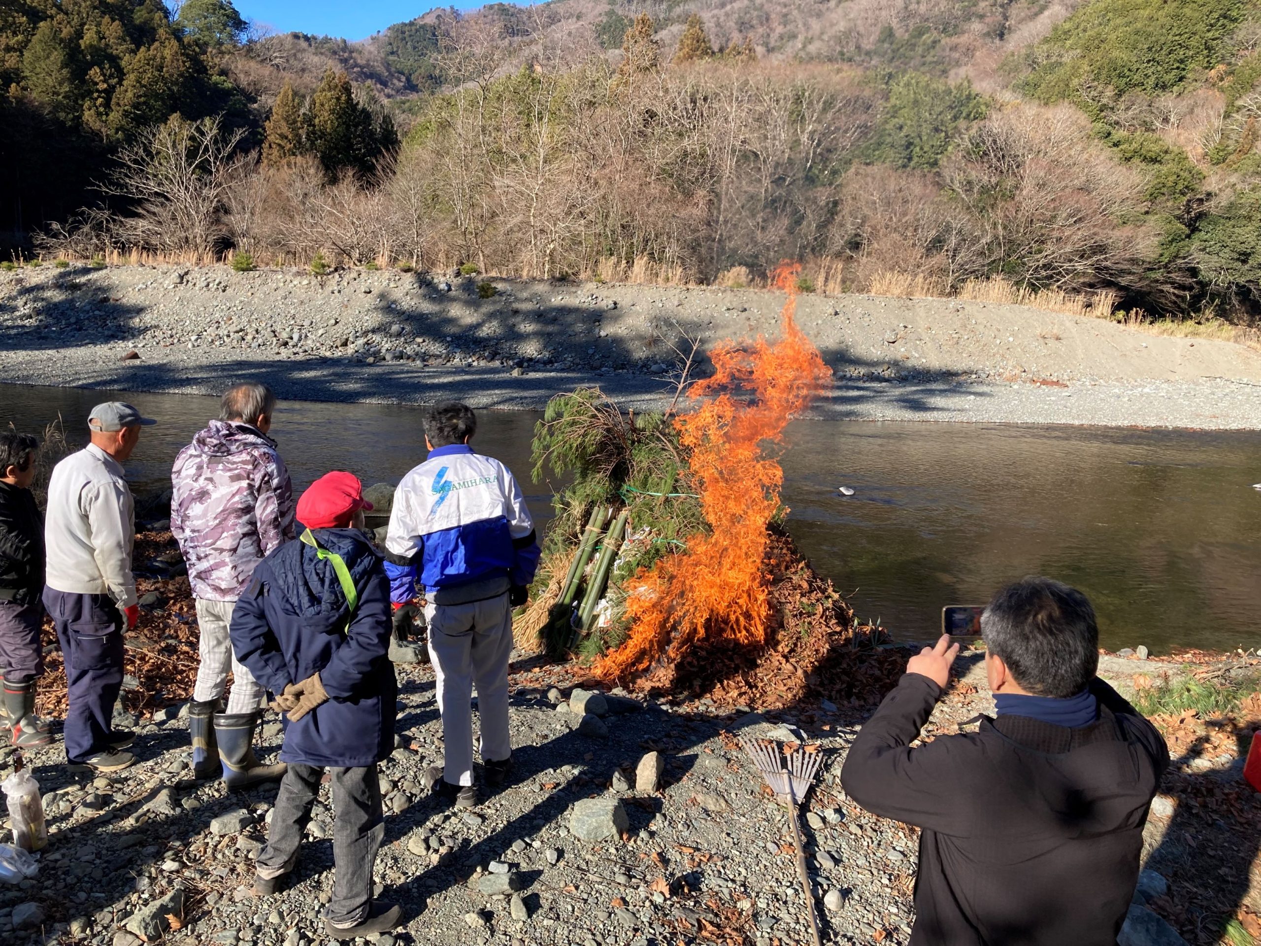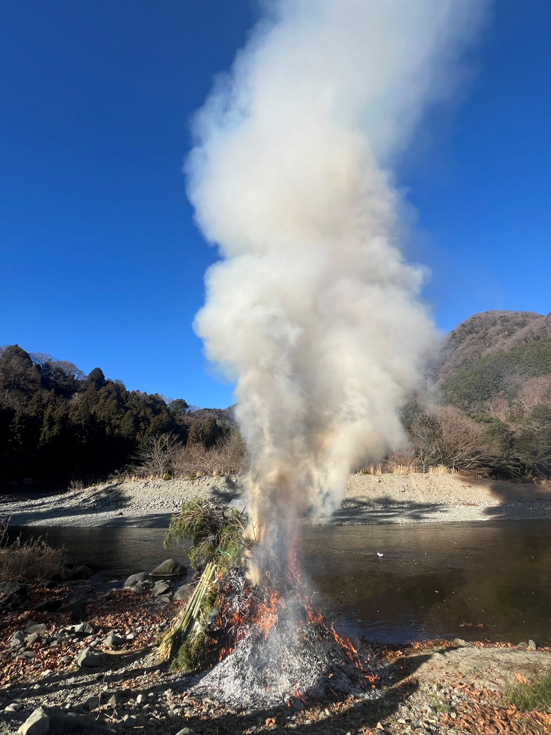 抜けるような青空に澄み切った空気の中、やぐらに点火すると一気に燃え上がり周囲の空気が熱くなります。そして白煙が立ち上がりました。煙に乗って歳神様が帰るという言い伝えもあります。