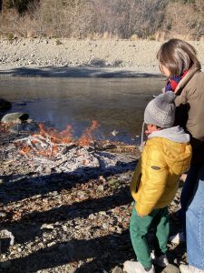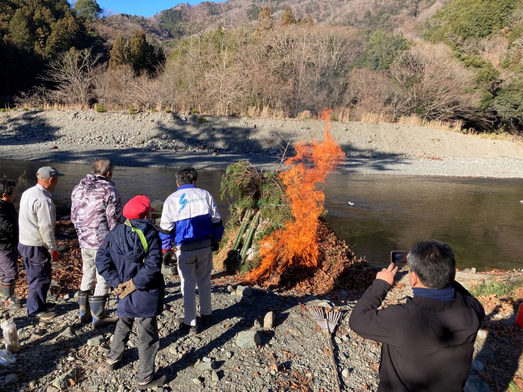 地域で正月飾りを持ち寄って、他に藁や青竹でやぐらを作り燃やすのが「どんど焼き」と呼ばれる小正月の行事です。青根苑のある上野田地区でも毎年行われており、私たちも参加させていただいております。(上野田地区では“だんご焼き”と呼んでいます)