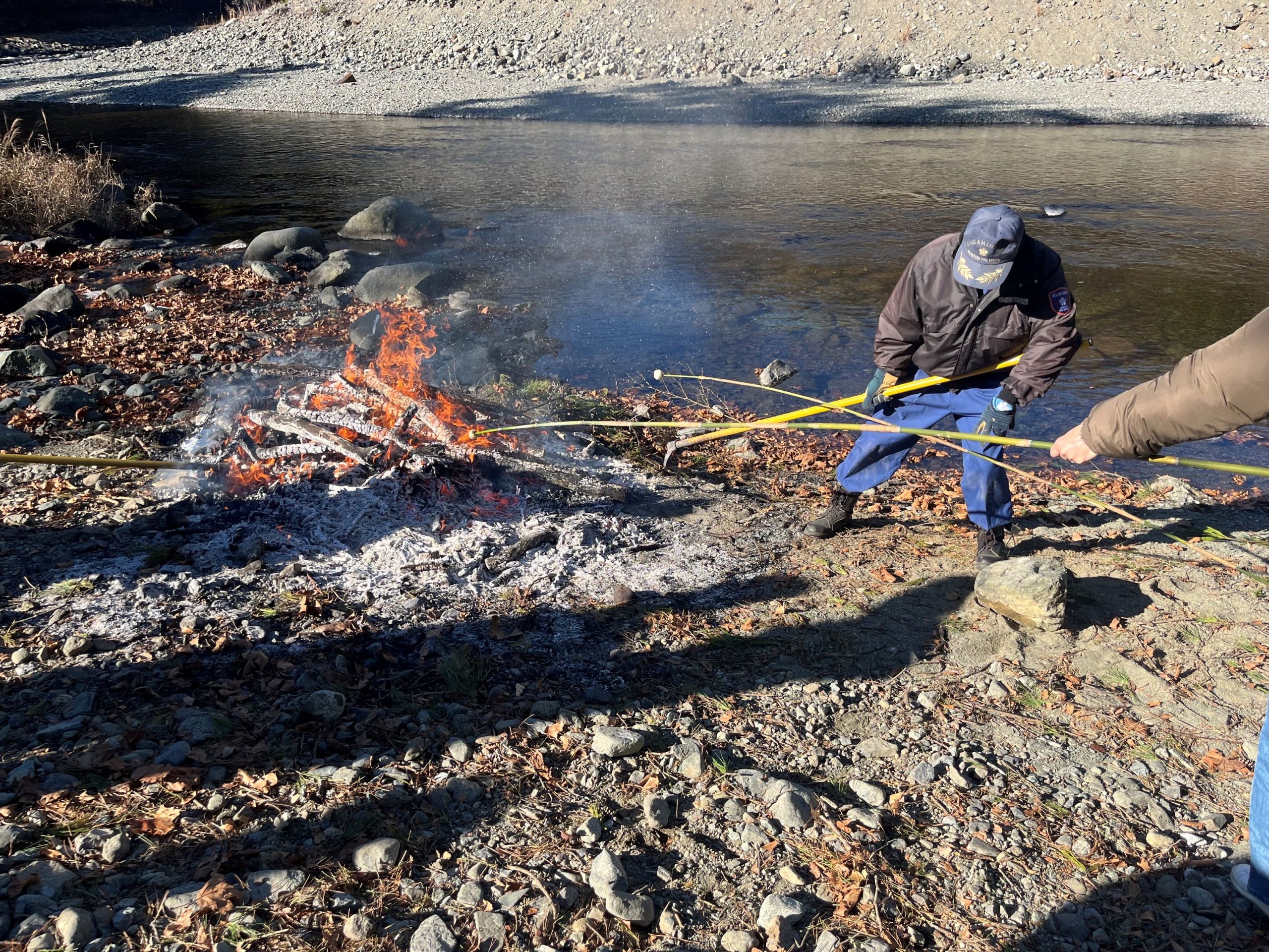 「みつまたの木が見当たらなくて…」と、釣り竿みたいな木でだんごを焼きます。この火で焼いて無病息災を願うそうです。