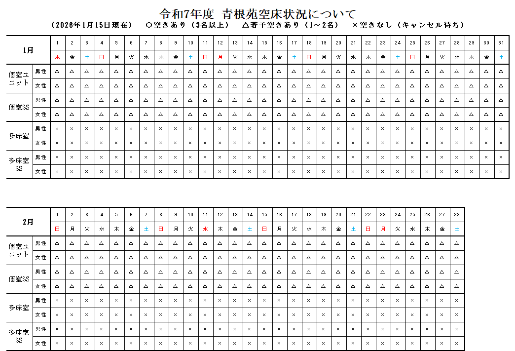 また、ユニット型個室・多床室の入居については早めのご案内が可能な場合も御座いますので、ご希望の際は青根苑まで直接お問合せい