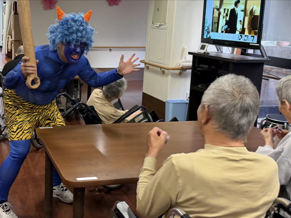 今年も職員が鬼役となり、顔にフェイスペイントを施して鬼に扮装しました。年々このフェイスペイントにも気合いが入り、今年は特にリアルな仕上がりに。登場した瞬間、驚きの声と笑い声が会場に広がりました。