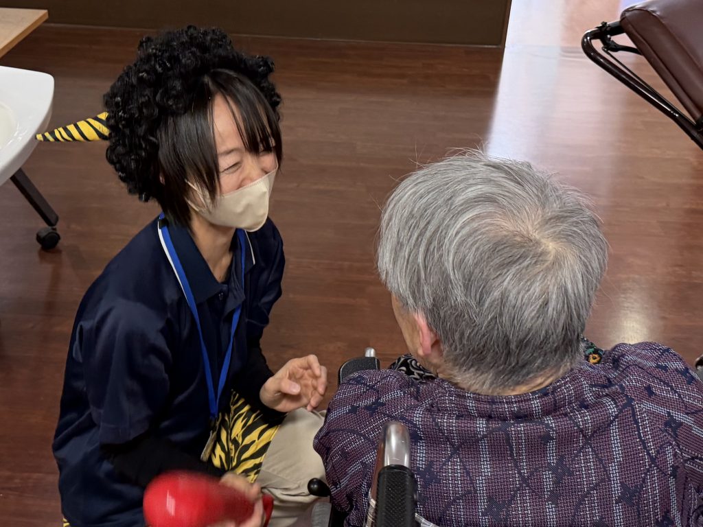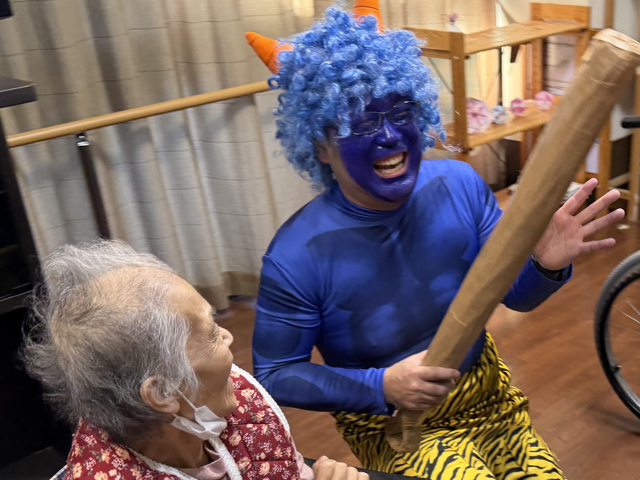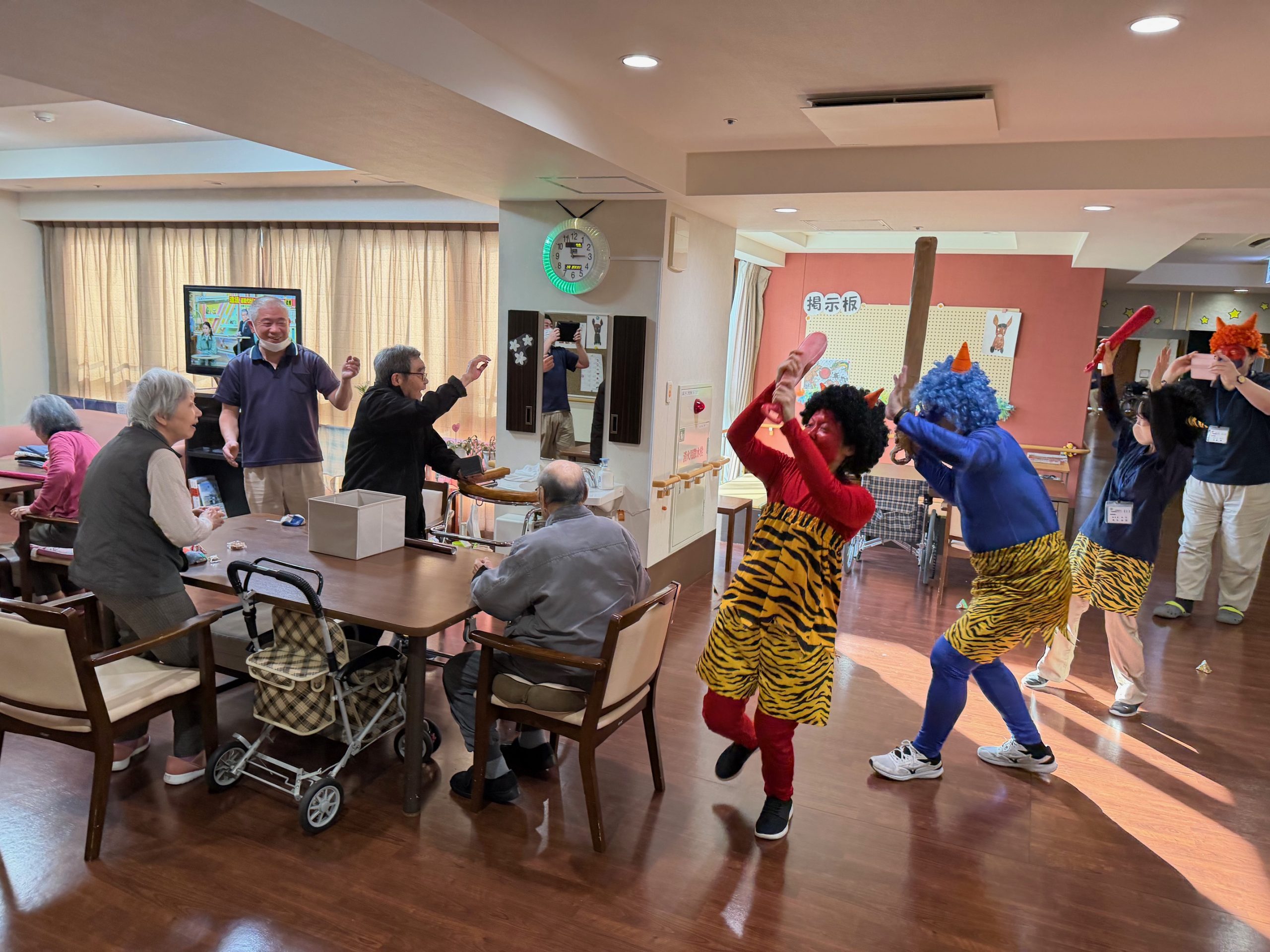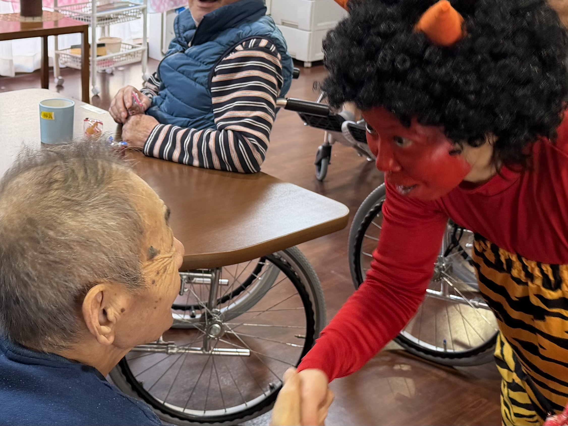 豆まきが始まると、ご入居者の皆さまの反応はさまざま。優しく鬼に豆を「どうぞ」と手渡してくださる方もいれば、「鬼は外!」と本気で豆を投げつける方もいて、会場は大盛り上がりでした。