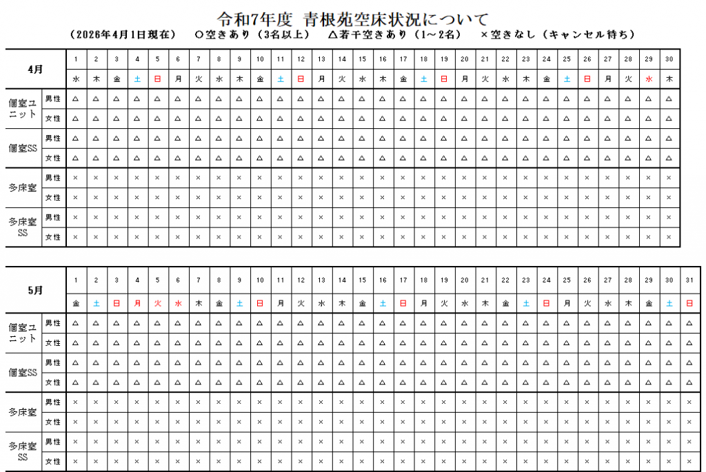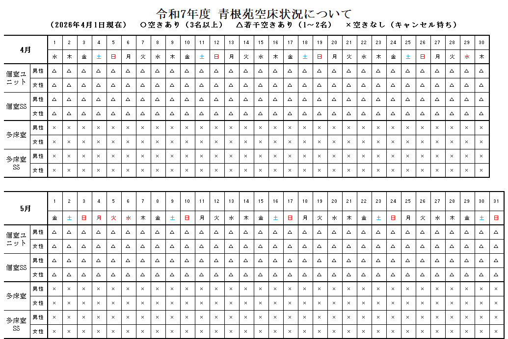 また、ユニット型個室・多床室の入居については早めのご案内が可能な場合も御座いますので、ご希望の際は青根苑まで直接お問合せい