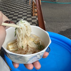 つゆはしょうゆ、ゴマダレから選んでいただき、ネギやショウガなど薬味をトッピング、みなさん美味しいと召し上がっていただきました。