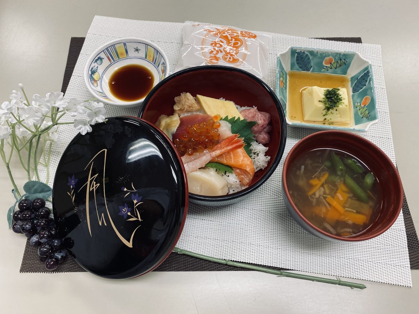 本日の昼食の献立は海鮮ちらしで、年に2回の一大イベントです。
