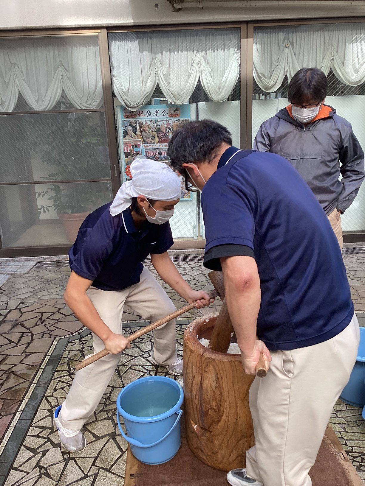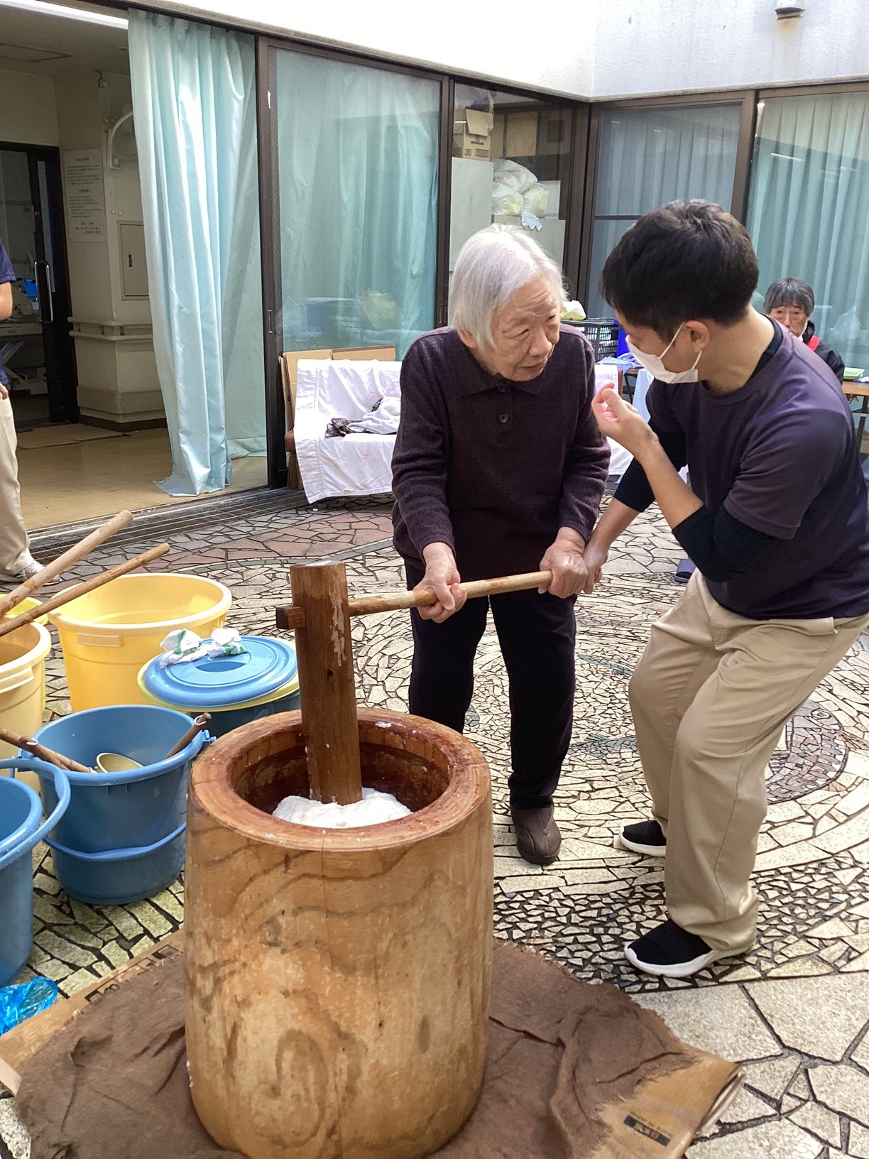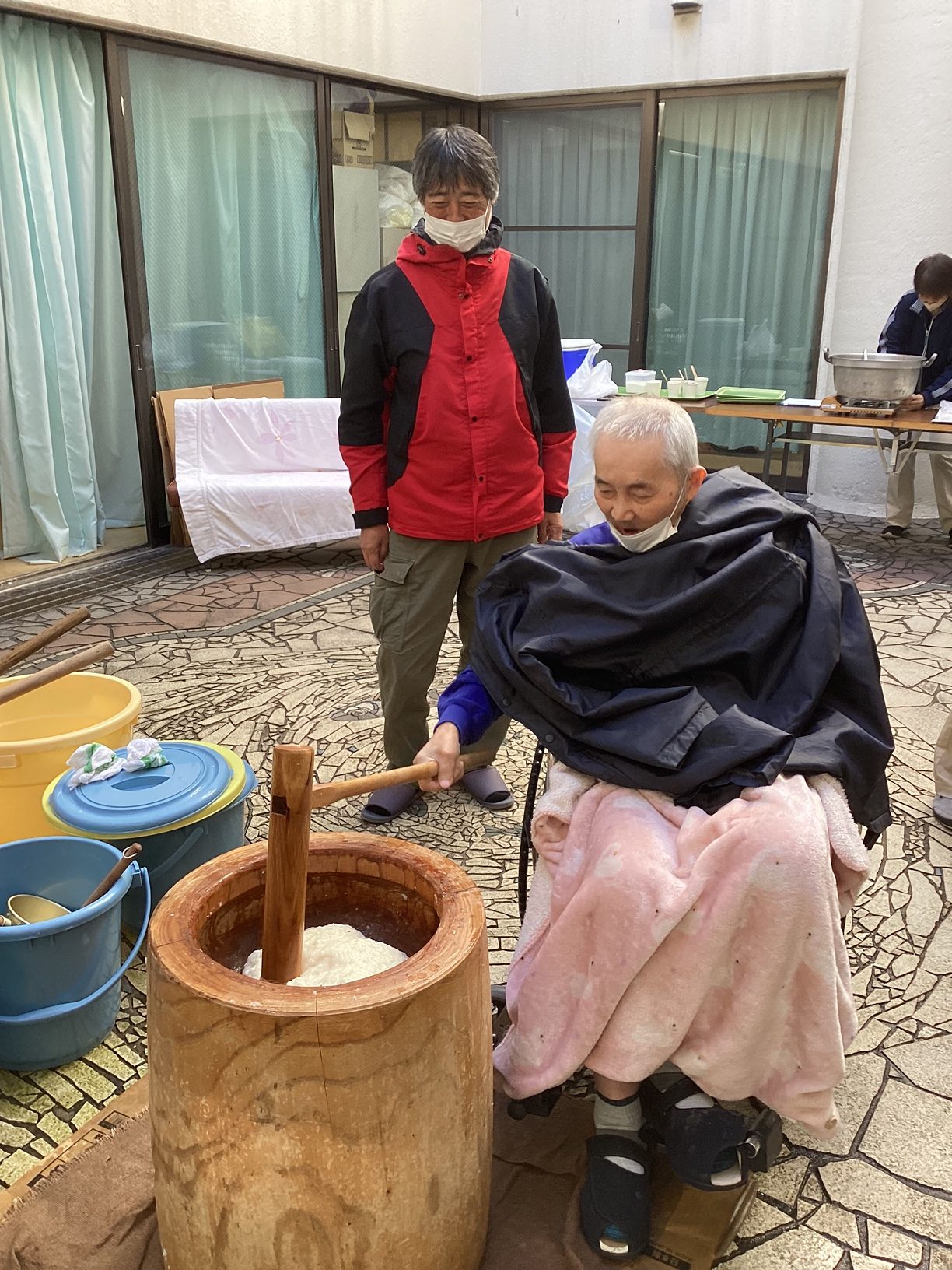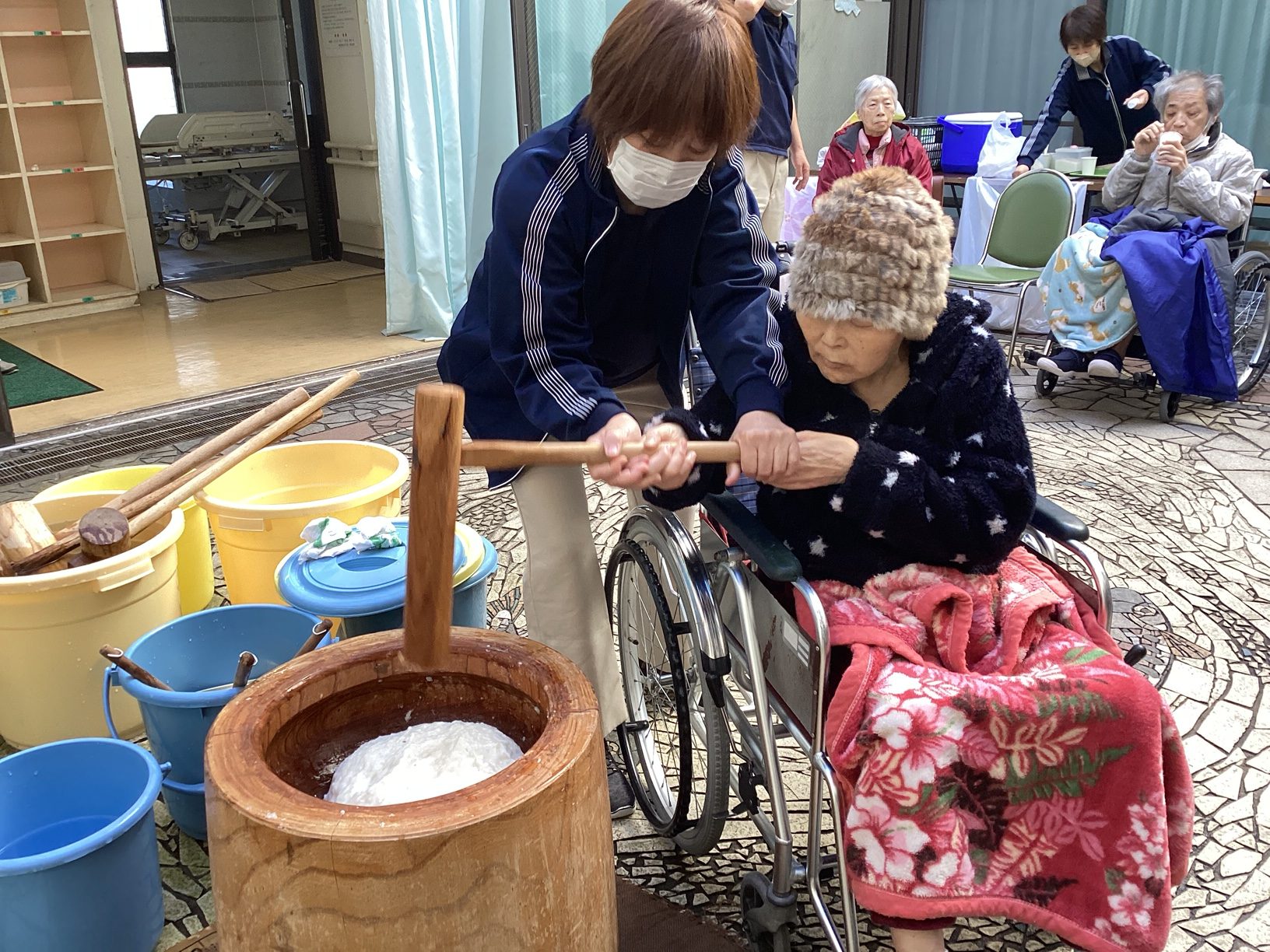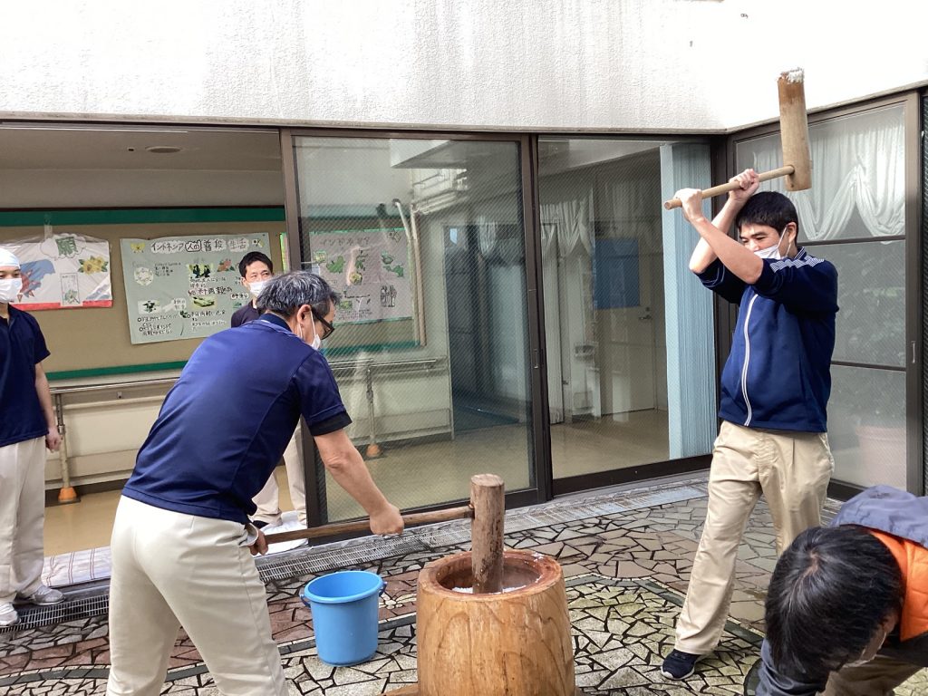 本日、今井苑では餅つきを行いました。餅つきを行うと、いよいよ年の瀬、一年はあっという間ですね。 餅つきはお正月を迎えるための準備ですが、今井苑では一年のうさばらしのように皆さん力いっぱい杵を振り下ろしていました。