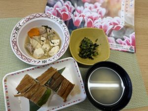 穴子押し寿司 味噌ちゃんこ鍋風 小松菜の磯和え かきたま汁 です。
