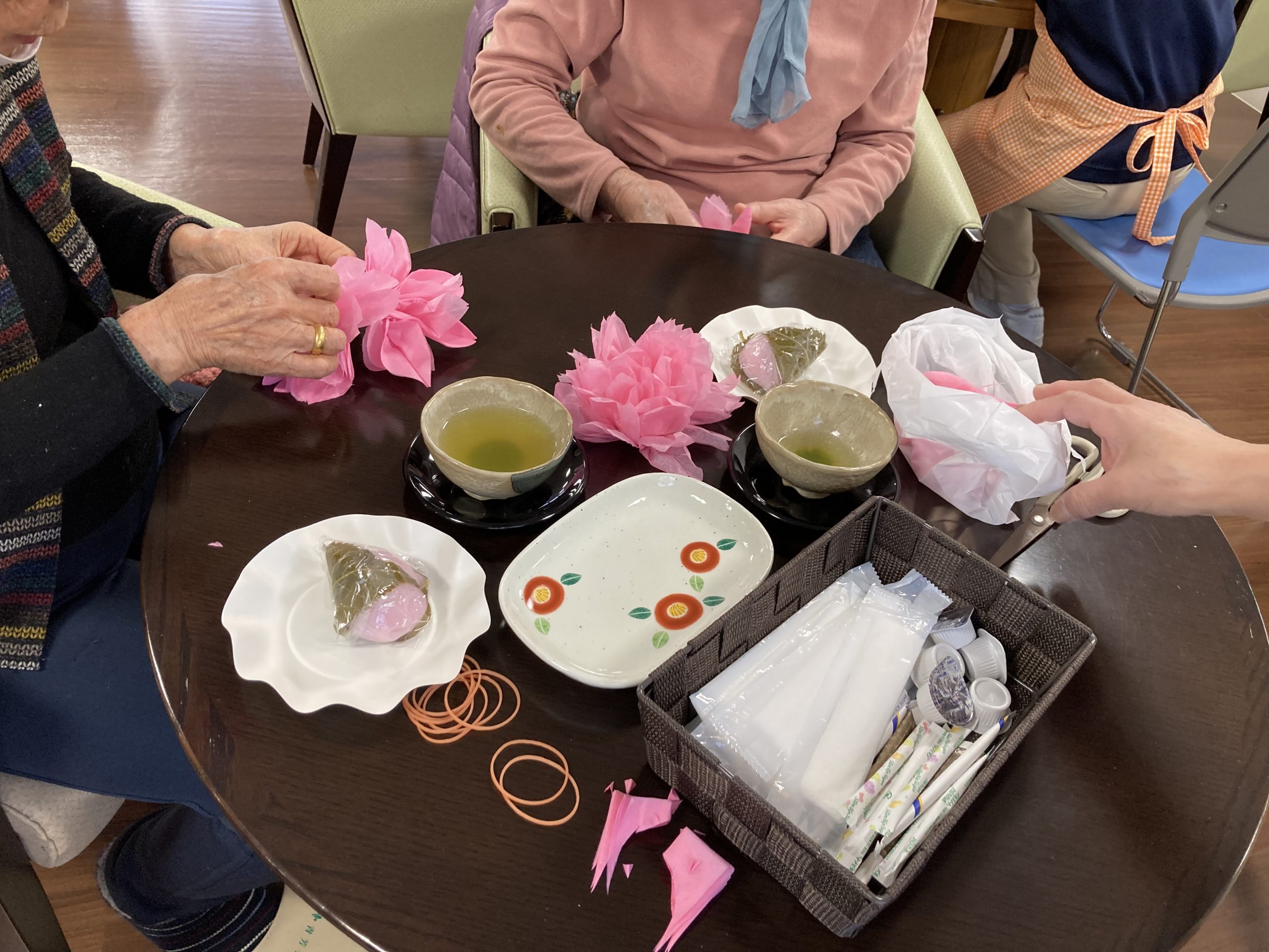 桜餅とお茶を召し上がりながら、お花飾りづくりもして頂きました。